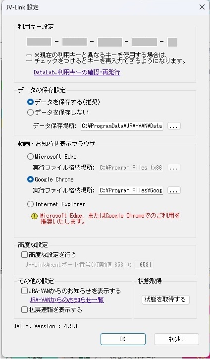 • JV-Linkの設定は、JRA-VAN データラボのサービス仕様に準拠します。JRA-VAN側のシステム変更などにより、本設定も変更が必要となる場合がありますので、JRA-VANの公式サイトも併せてご確認ください。