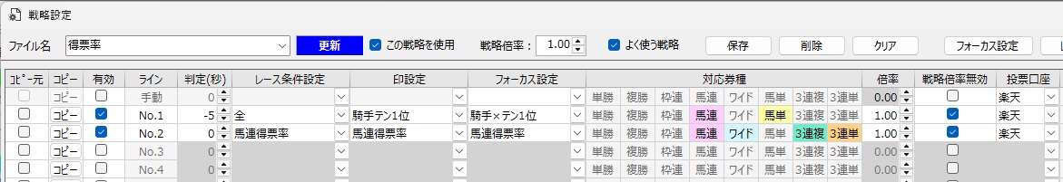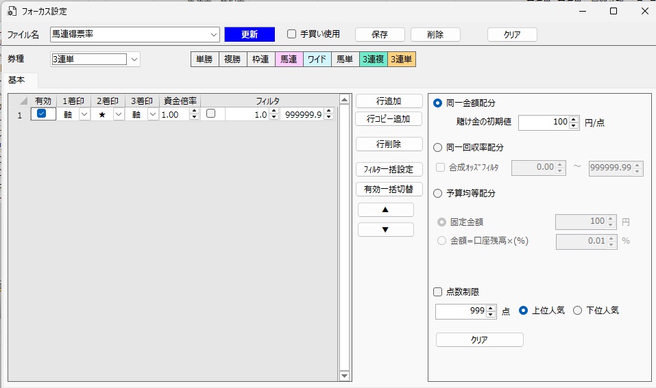 資金配分・合成オッズ・点数制限など細かく設定できます。