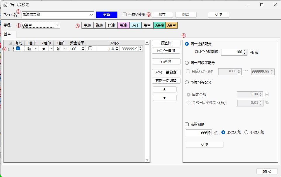 購入対象とする馬券の券種や買い目の組み合わせを詳細に設定する方法を解説します。