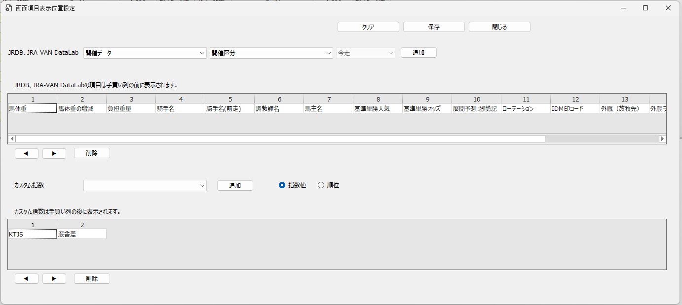 JRDBおよびJRA-VAN DataLab.から提供されるデータ項目を、表示する項目として追加・設定するエリアです。